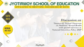 A relevant Webinar session for the Students and Teachers was organised by JYOTIRMOY SCHOOL OF EDUCATION (JSE) on the topic- "IMPACT OF VIRTUAL CLASSROOM ON STUDENTS' MENTAL HEALTH WITH SPECIAL REFERENCE TO NATIONAL EDUCATION POLICY 2020" scheduled on 24 July, 2021 at 2:00 PM.